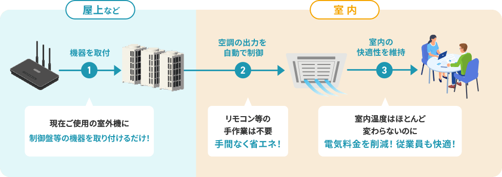 エネルギーコスト削減、脱炭素に向けた取り組みのために、まず始めるべきは 「空調の省エネ」 です。現在お使いの空調機に制御用コンピューターを取り付けるだけで、省エネと快適性の両立ができる全く新しいサービスです。